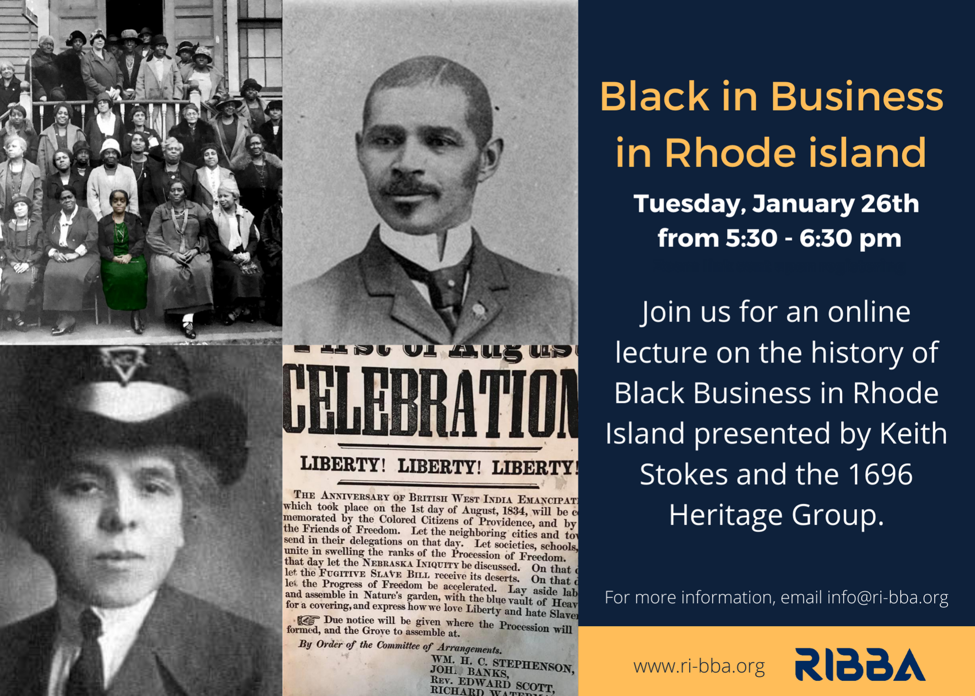 Join us for an online lecture on the history of Black Business in Rhode Island presented by Keith Stokes and the 1696 Heritage Group on Tuesday, January 26th from 5:30 - 6:30 pm.