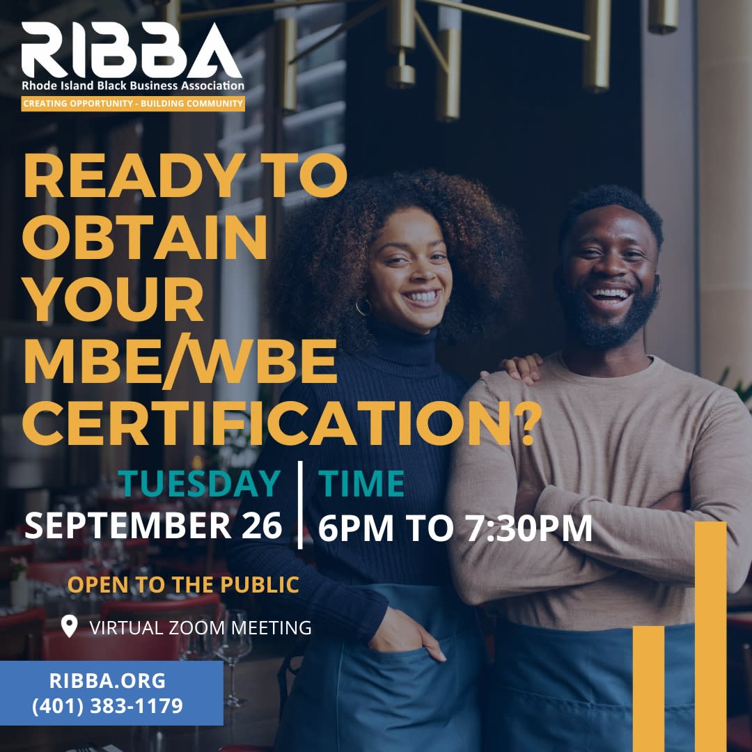 Join us on Tuesday, September 26, 2023 for our MBE/WBE Certification Application Assistance Virtual Workshop from 6PM - 7:30PM. The workshop, which will be hosted by RIBBA, will give insight to minority business owners and explain the application process of becoming certified with the State of Rhode Island. State certification makes minority businesses eligible to work on state funded projects.